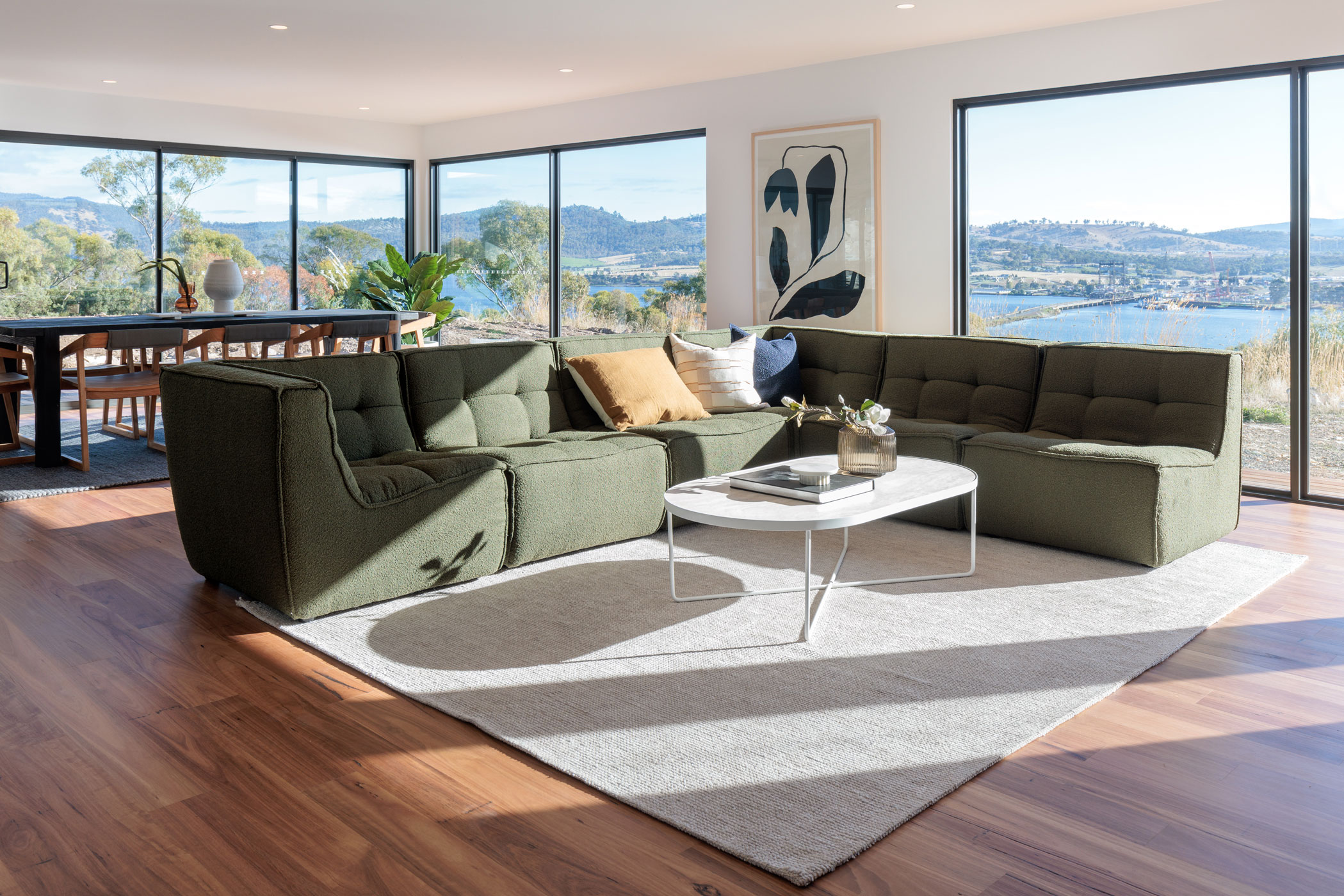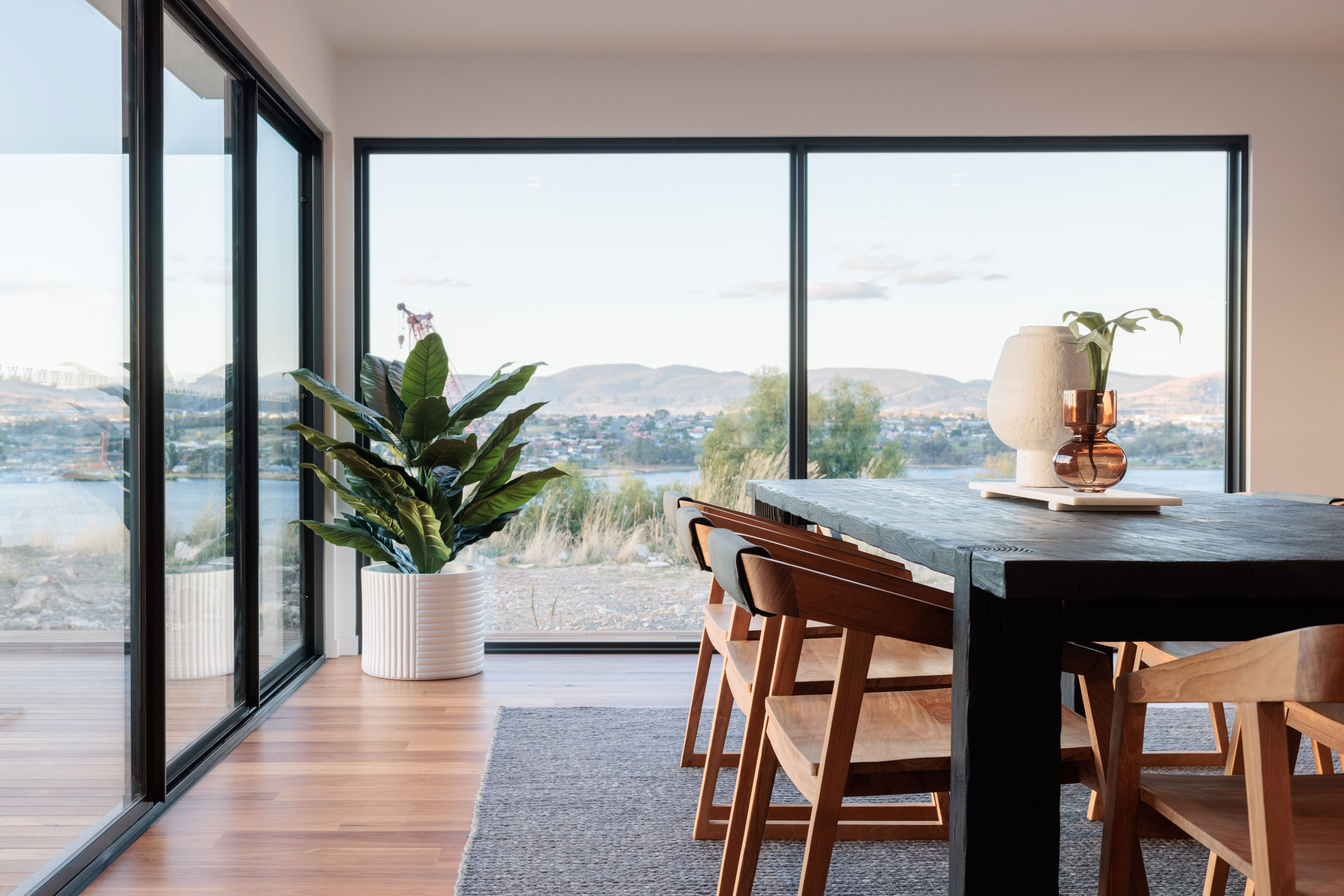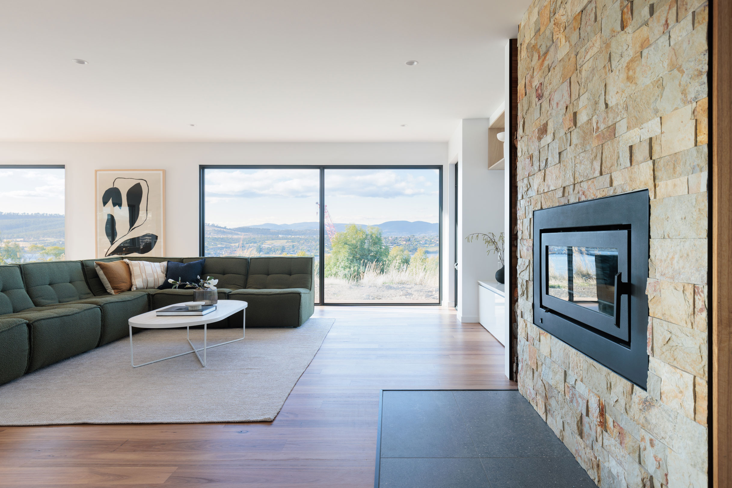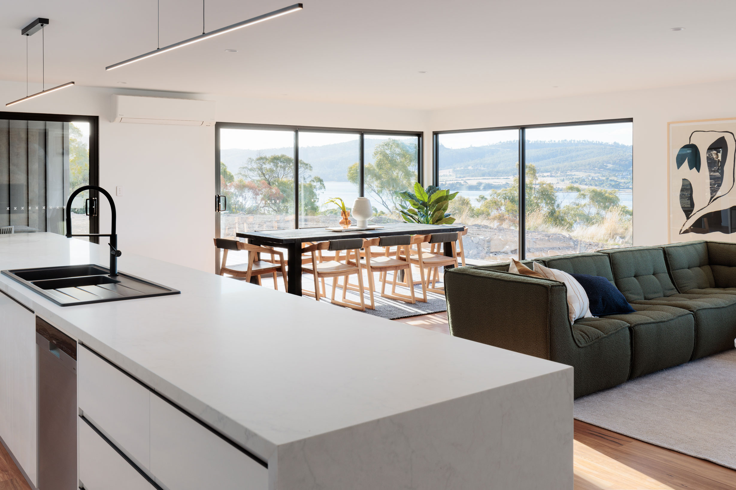 The clients sought a modern, spacious design that would capitalise on a site with commanding Derwent River views and a northerly aspect. A large, light-filled kitchen/ family /dining space would form a central hub, with quality custom finishes inside and out.