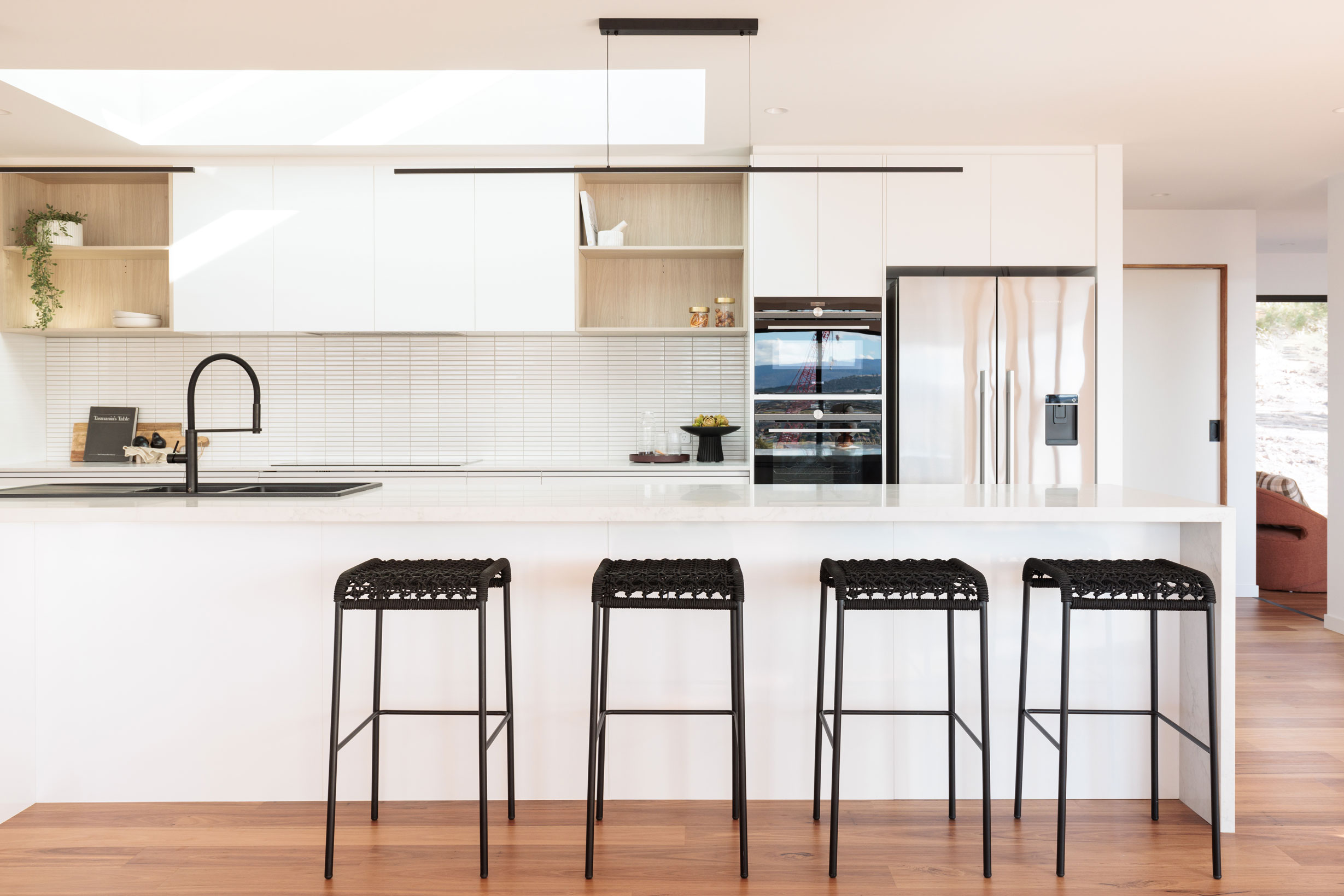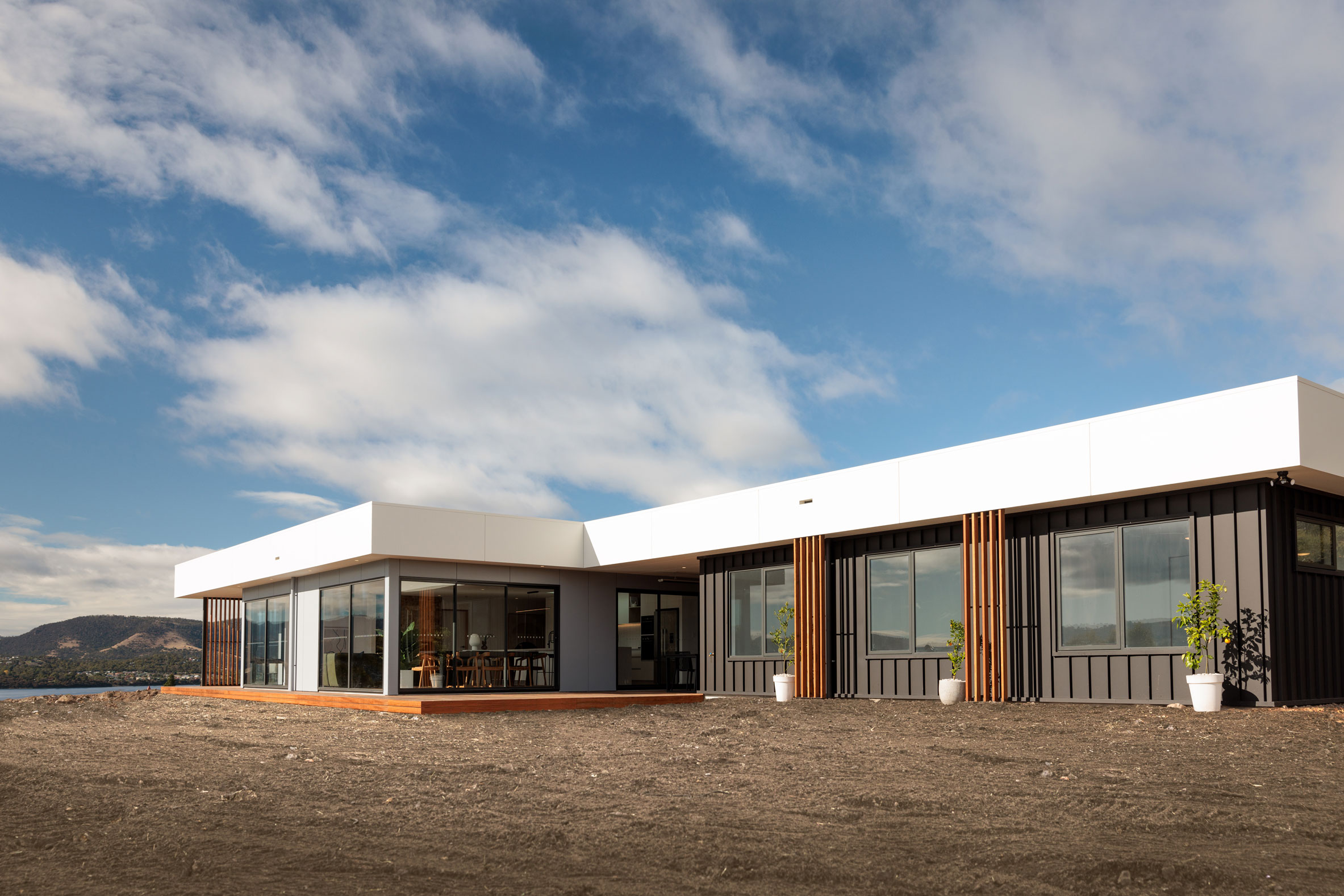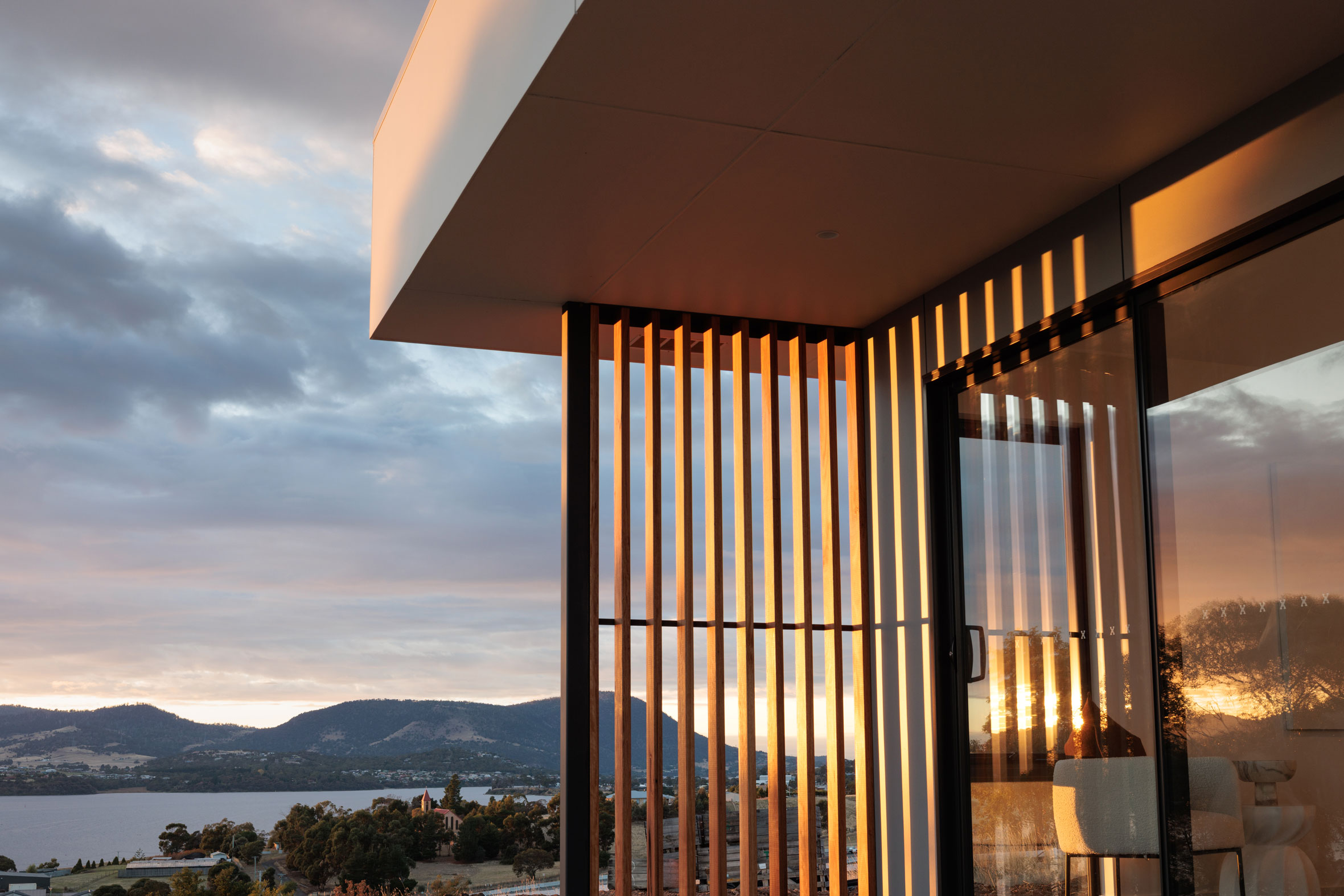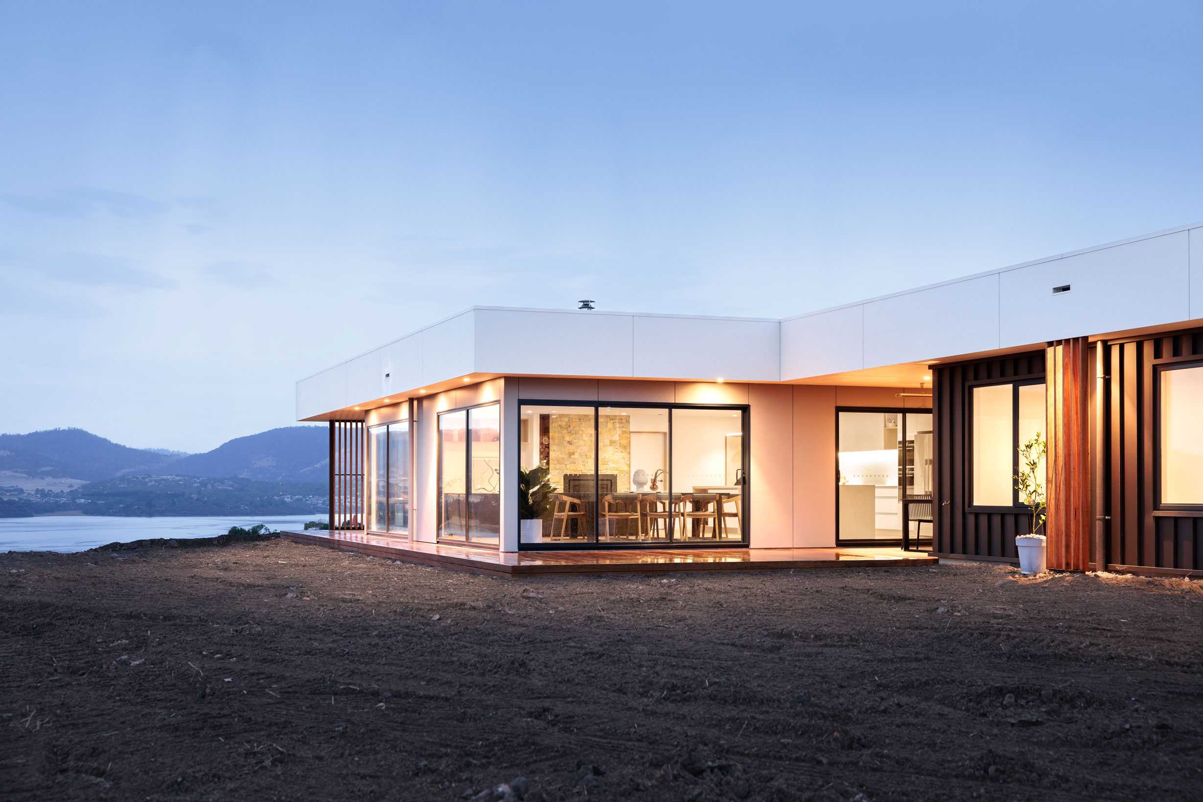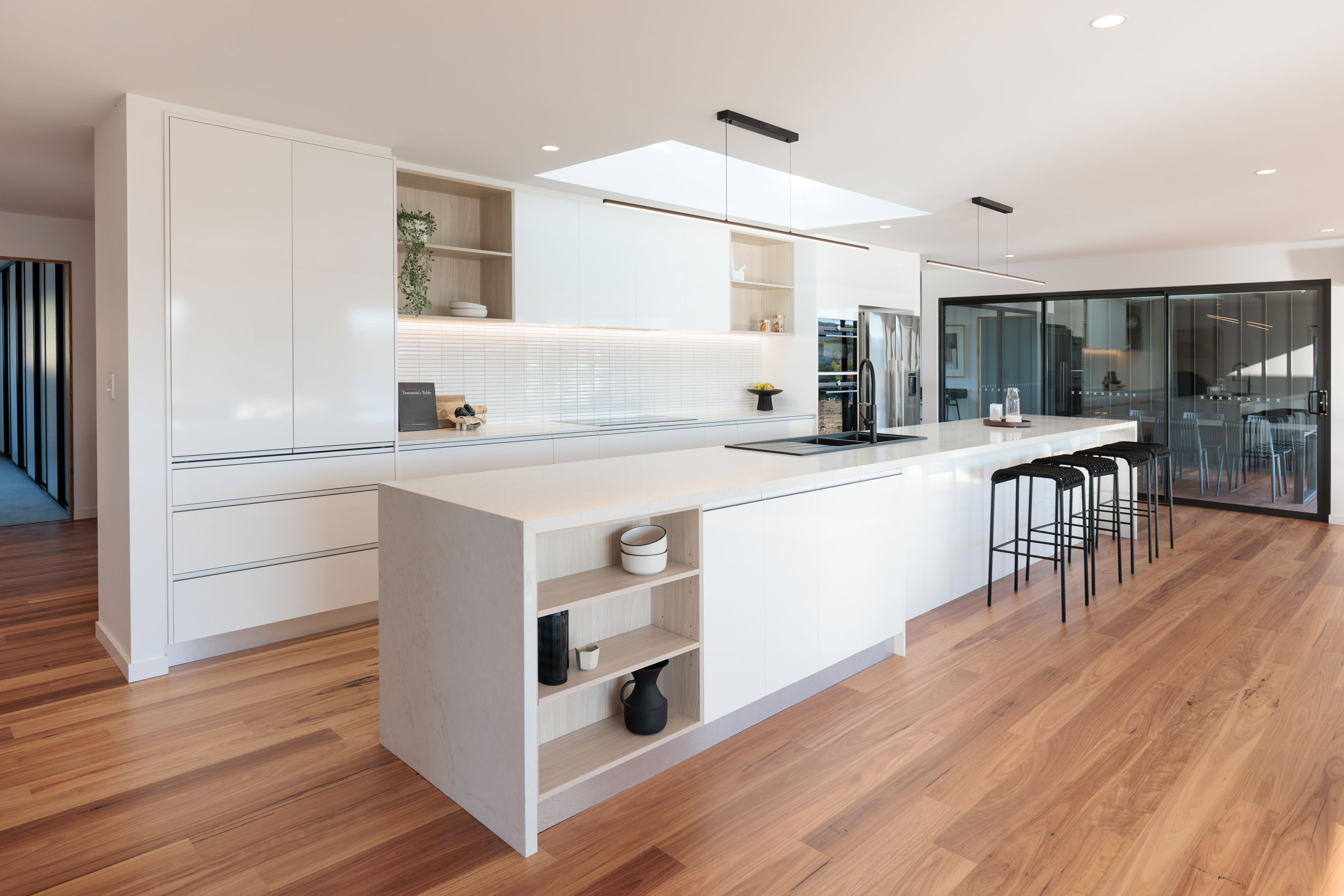 The clients sought a modern, spacious design that would capitalise on a site with commanding Derwent River views and a northerly aspect. A large, light-filled kitchen/ family /dining space would form a central hub, with quality custom finishes inside and out.