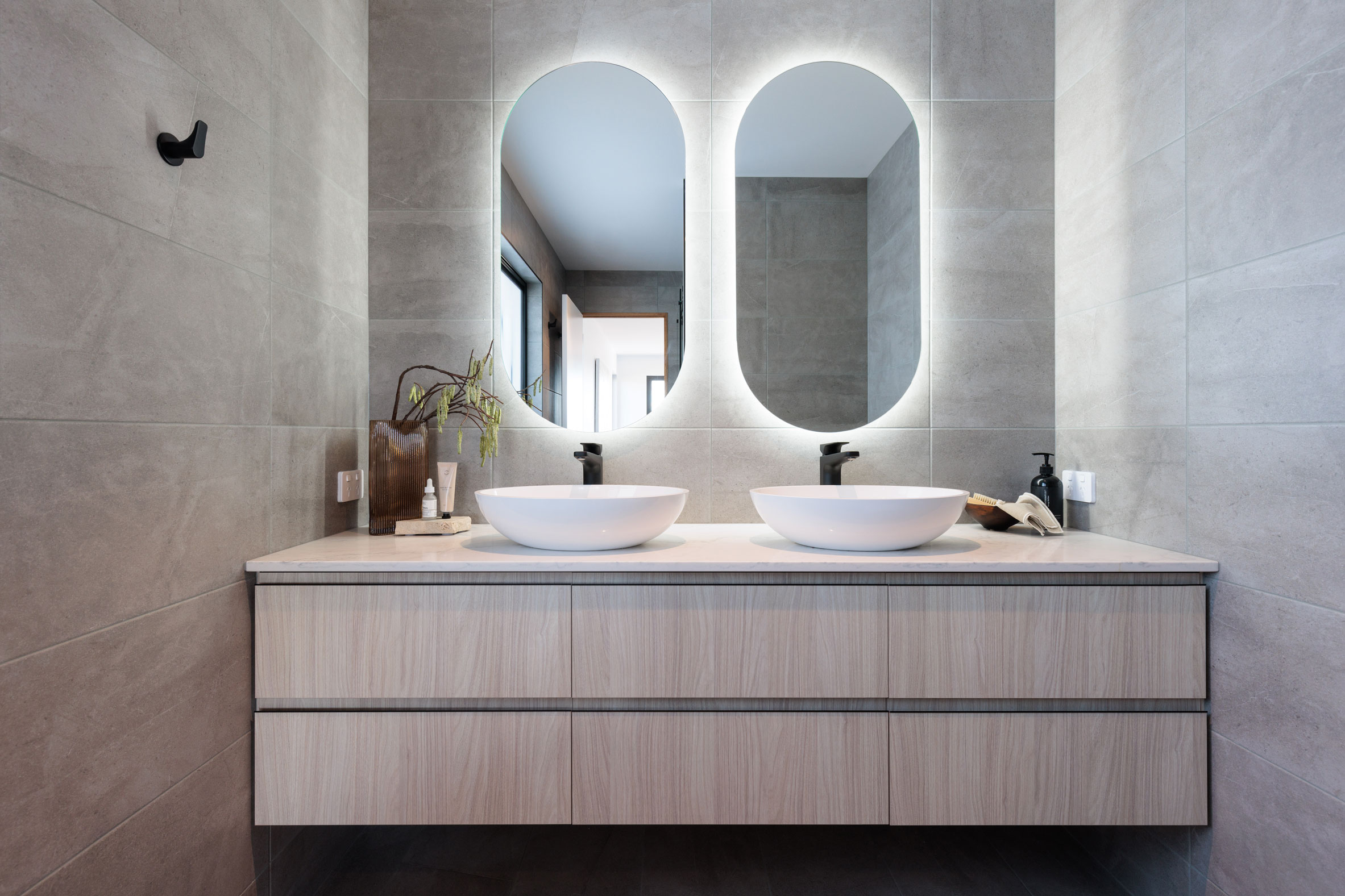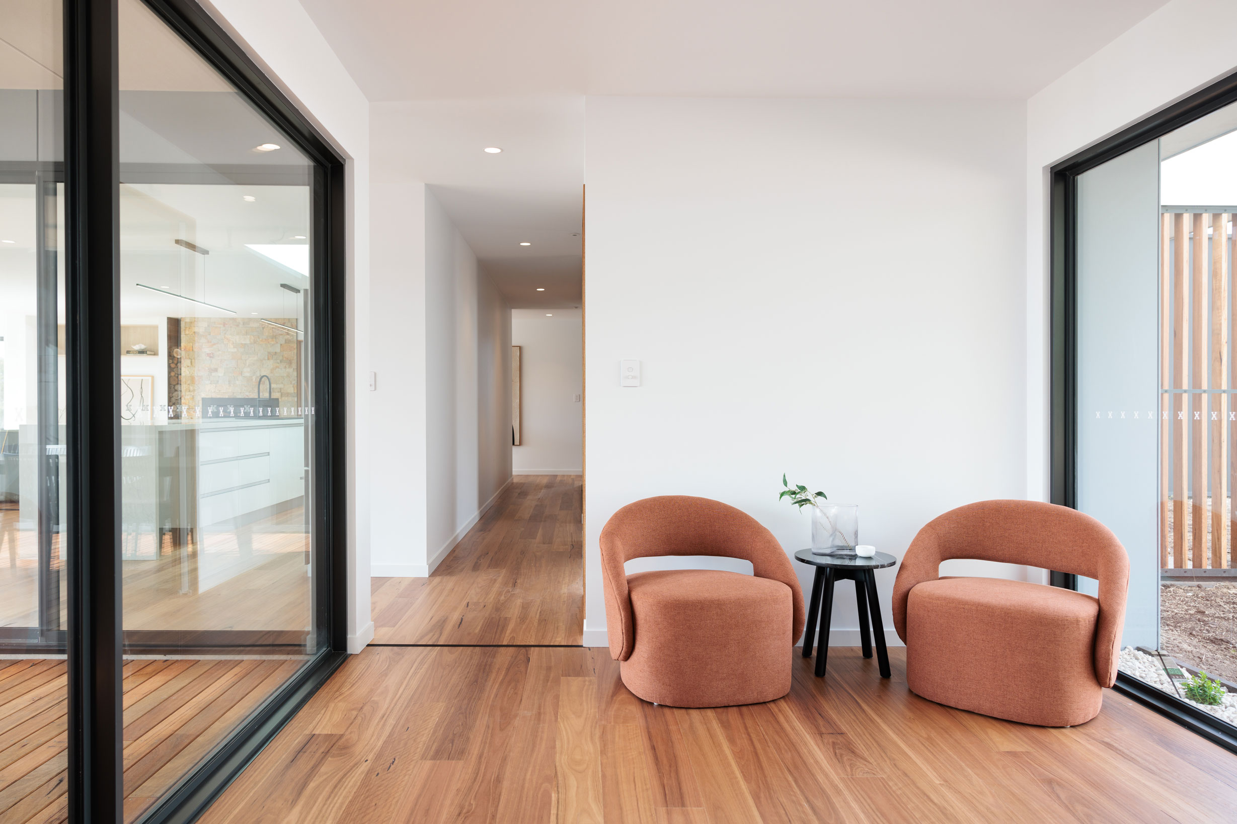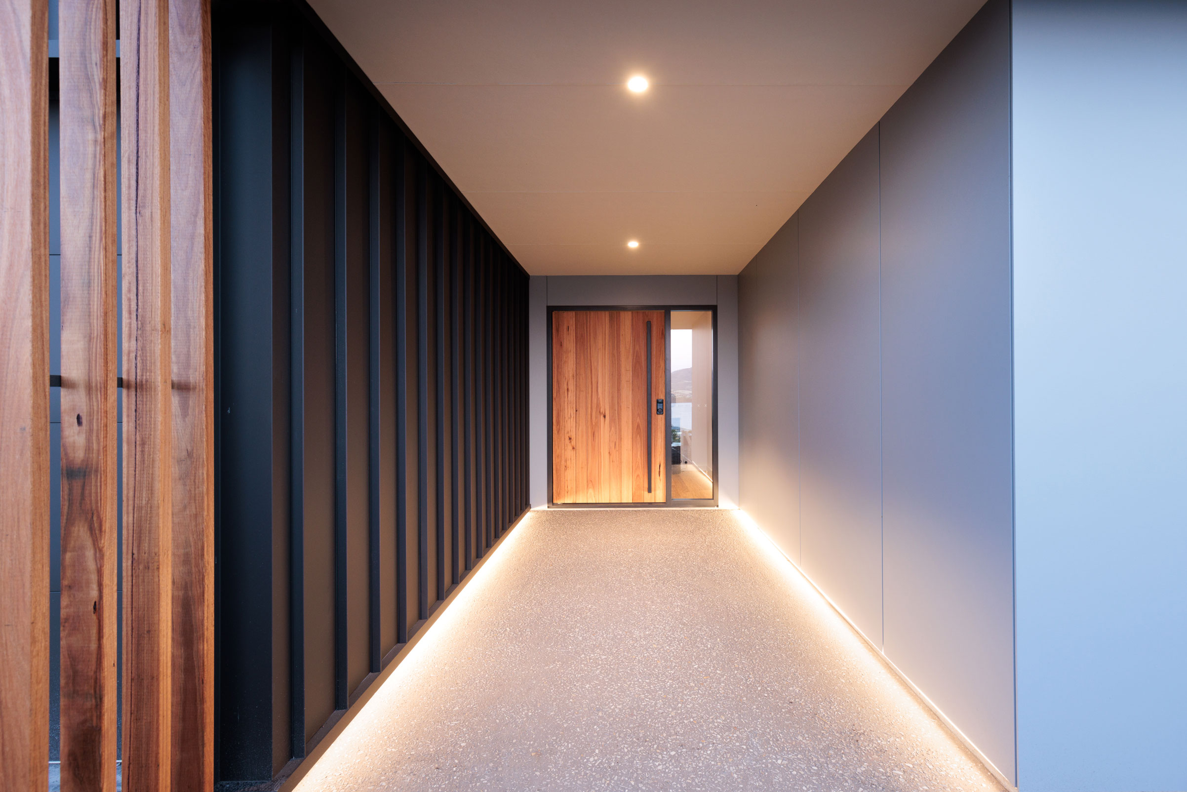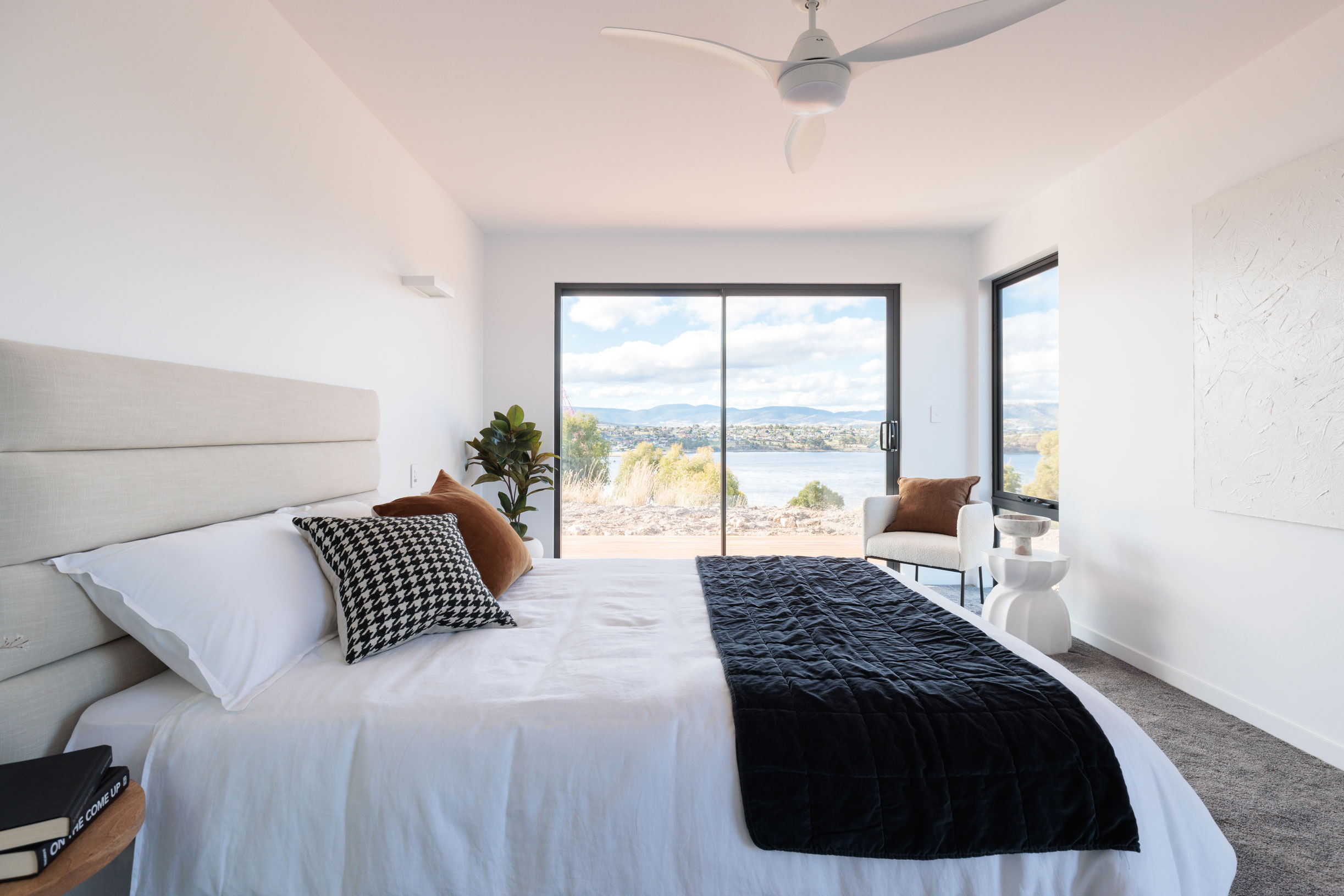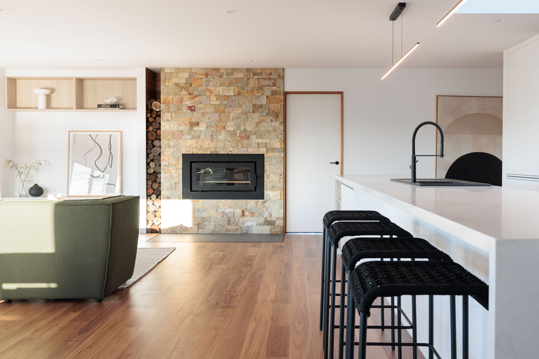 The clients sought a modern, spacious design that would capitalise on a site with commanding Derwent River views and a northerly aspect. A large, light-filled kitchen/ family /dining space would form a central hub, with quality custom finishes inside and out.