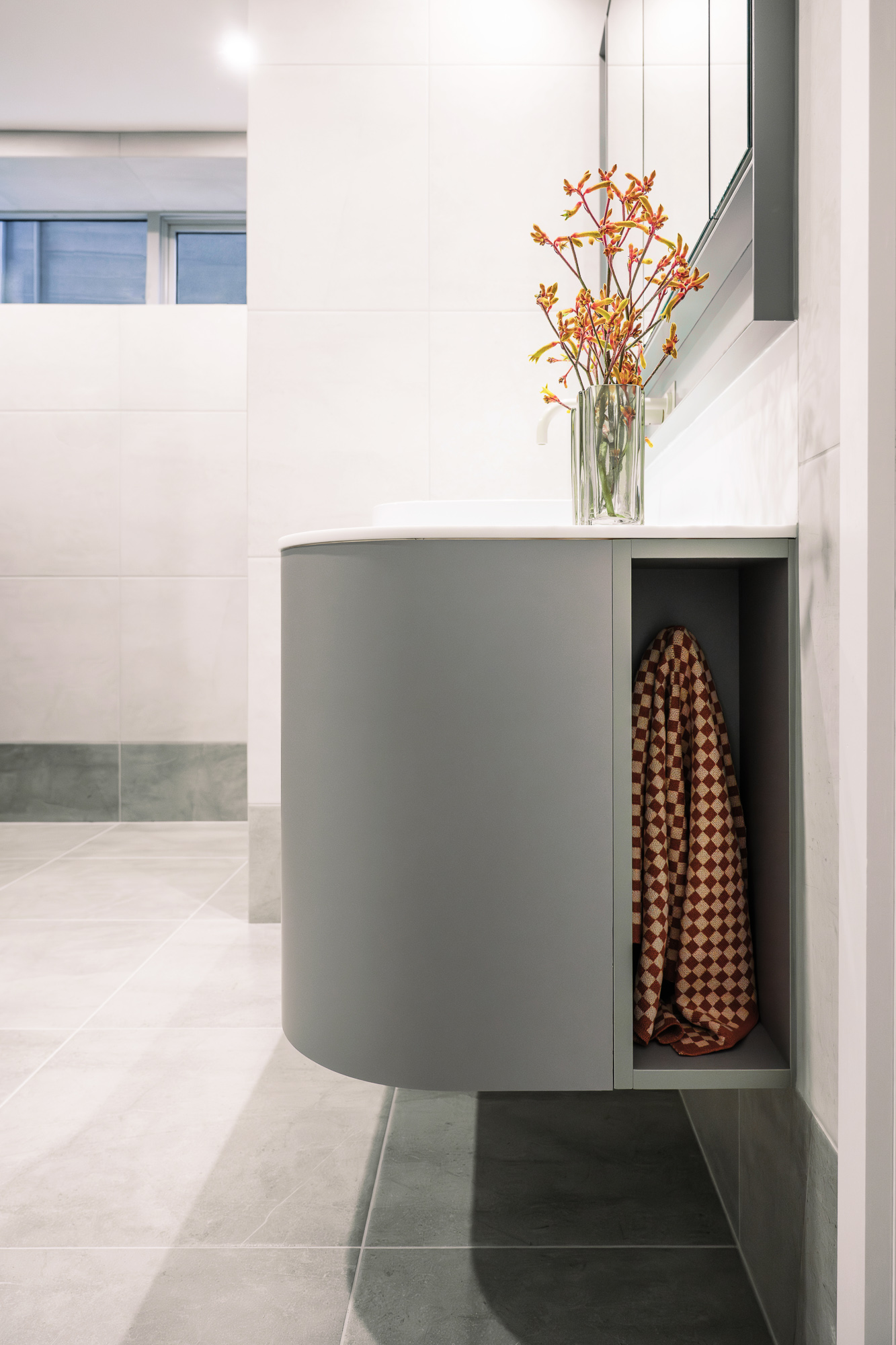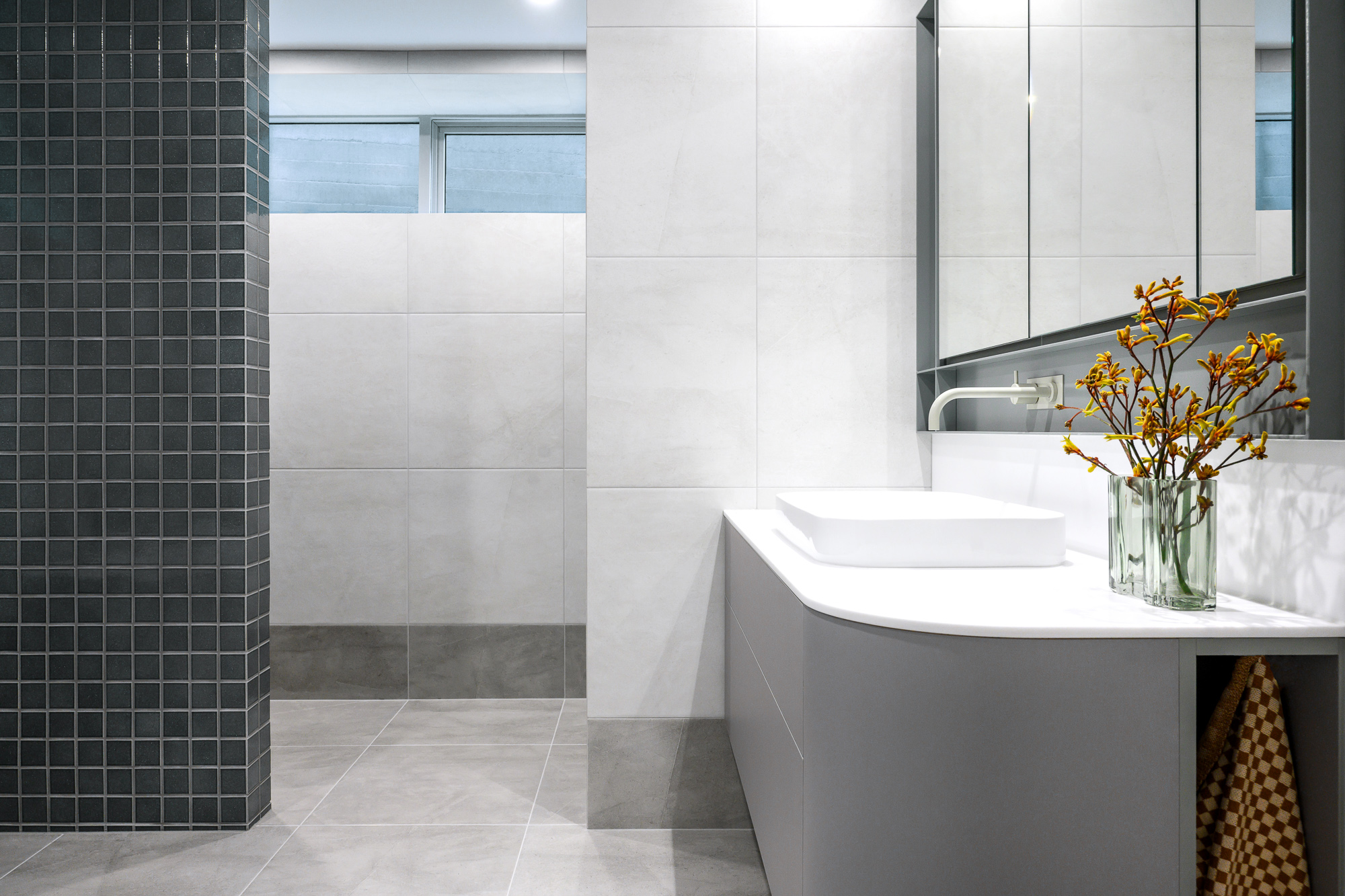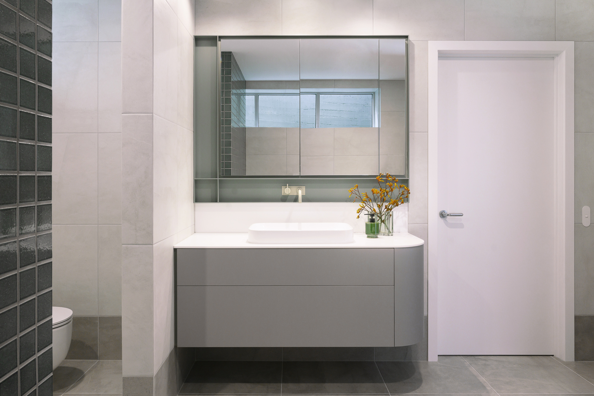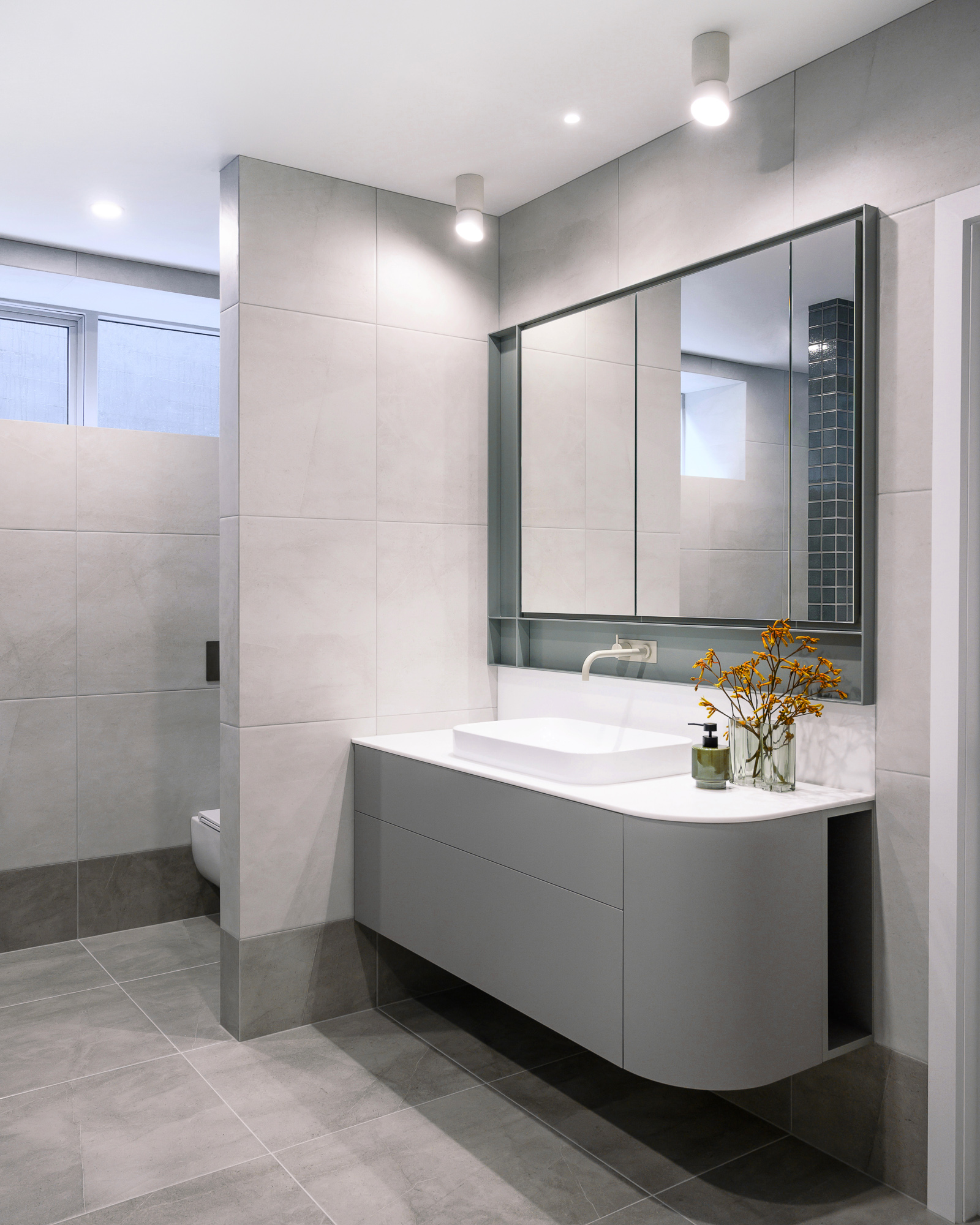 Description An elegantly updated bathroom to maximise function and strengthen connection to the surrounding environment.Interior DesignerValentine Interiors + DesignJoinerCustom Cabinets TasmaniaPhotographerLoic Le Guilly Key features Introduction of partition walls concealing the shower and toilet area.Powder-coated steel mirror cabinet surround and shower niches.Custom wall hung curved vanity unit with soft close drawers and integrated hand towel niche.Custom recessed mirror cabinet. Floor to ceiling tiling with mitred external corners and detailed setout.Electric under tile floor-heating with touch screen control.Brushed graphite and power coated plumbing fixtures and vertical heated towel rails.Feature lighting. 8
