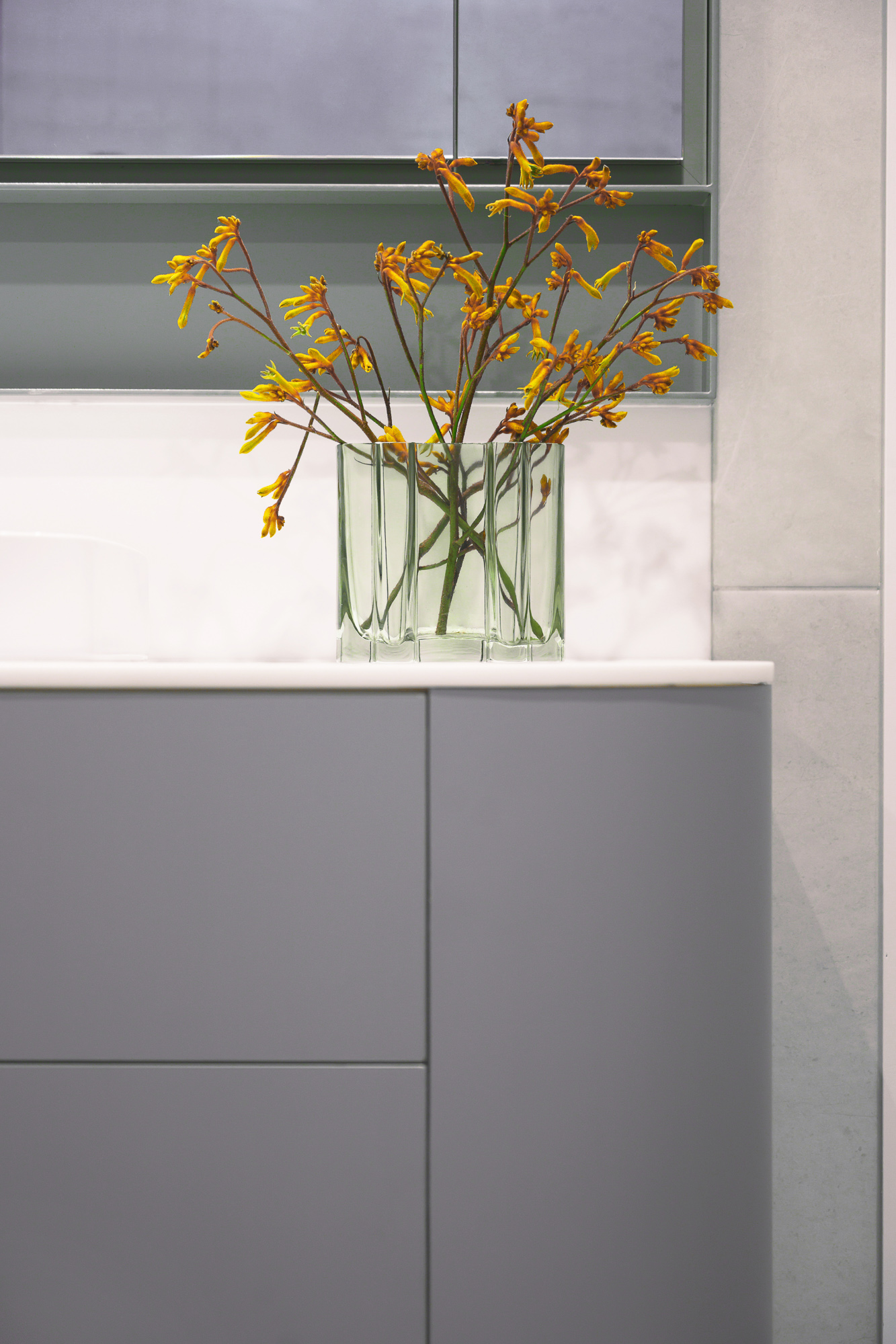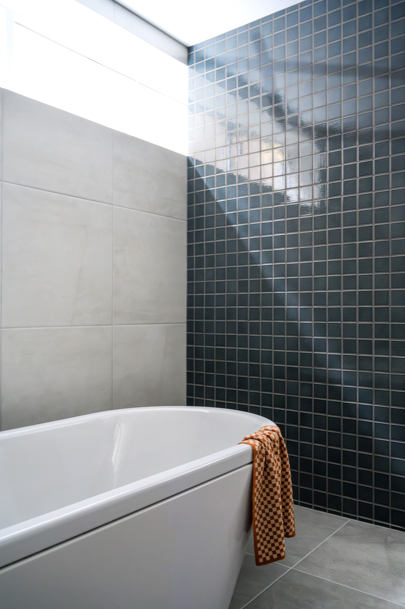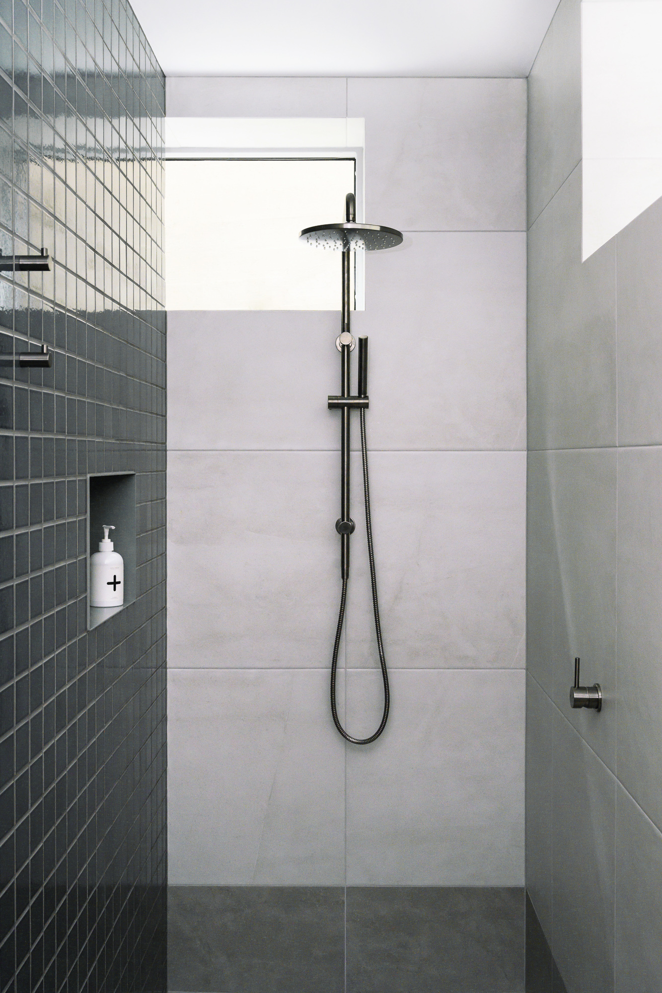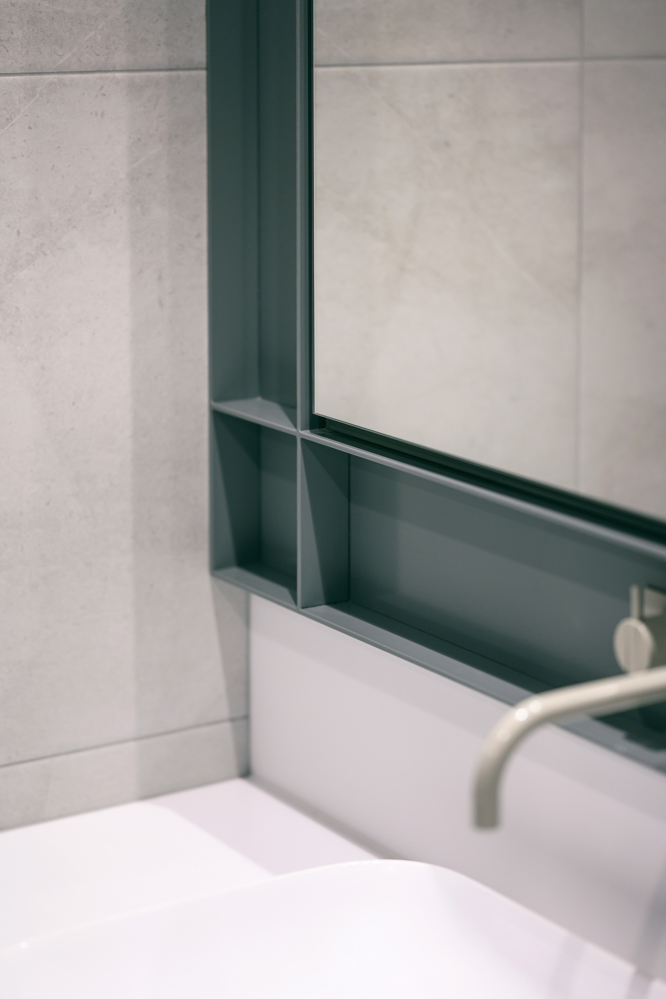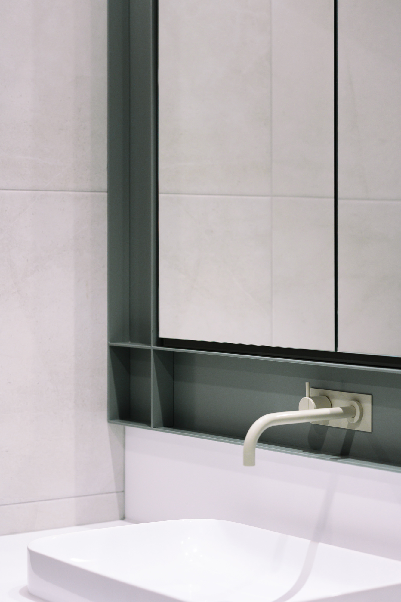 Description An elegantly updated bathroom to maximise function and strengthen connection to the surrounding environment.Interior DesignerValentine Interiors + DesignJoinerCustom Cabinets TasmaniaPhotographerLoic Le Guilly Key features Introduction of partition walls concealing the shower and toilet area.Powder-coated steel mirror cabinet surround and shower niches.Custom wall hung curved vanity unit with soft close drawers and integrated hand towel niche.Custom recessed mirror cabinet. Floor to ceiling tiling with mitred external corners and detailed setout.Electric under tile floor-heating with touch screen control.Brushed graphite and power coated plumbing fixtures and vertical heated towel rails.Feature lighting. 8